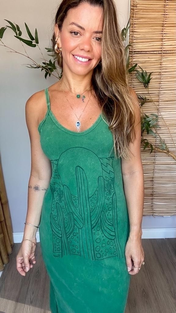 Vestido Midi Alça Paisagem Com Cacto Verde Bandeira